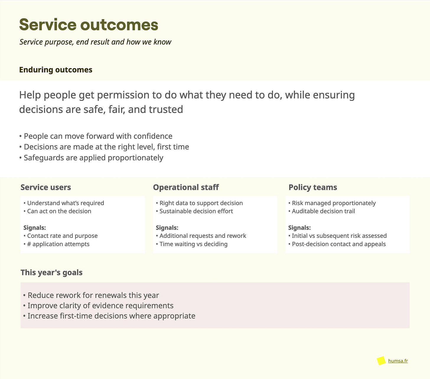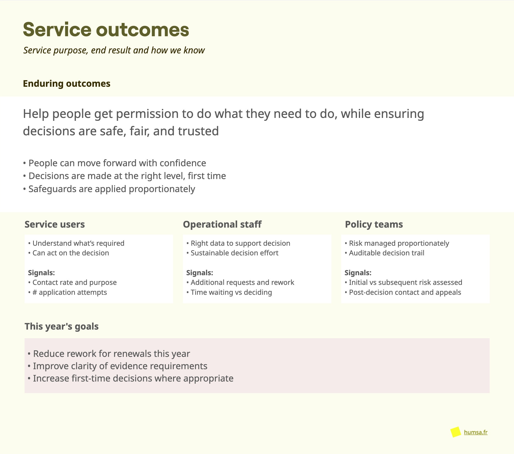This is a familiar and foundational intervention that Kate Tarling has articulated beautifully. Defining service outcomes is really about naming the service and its purpose: something that’s often assumed, contested, or disagreed on (whether openly or not).